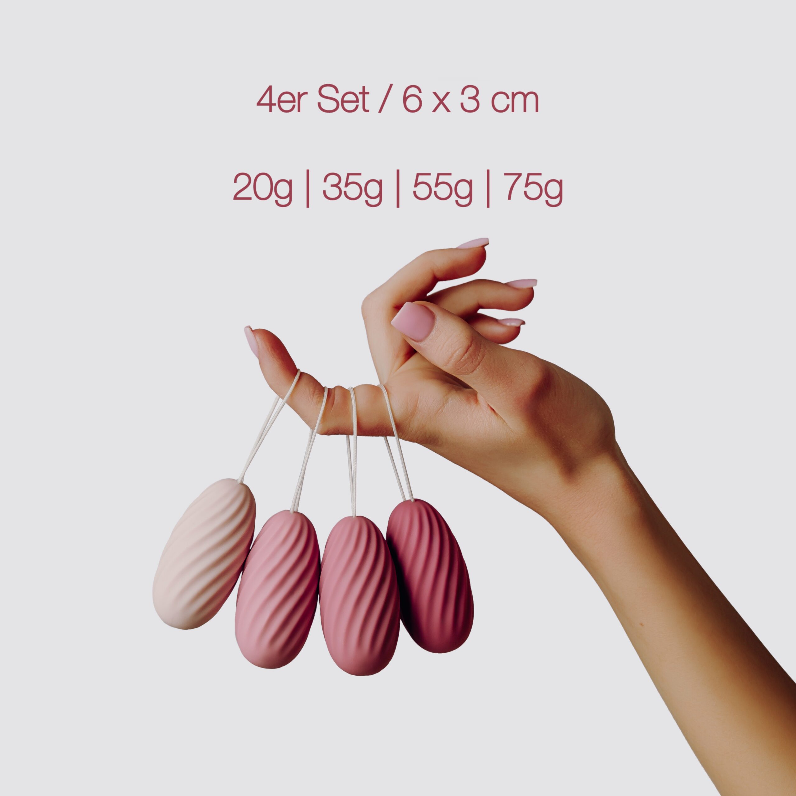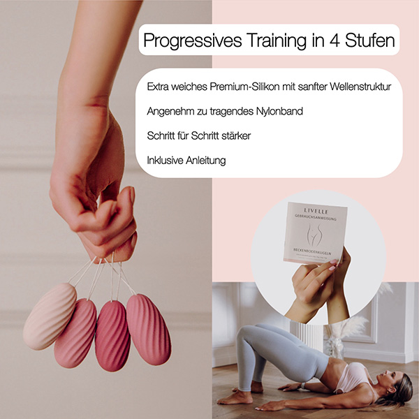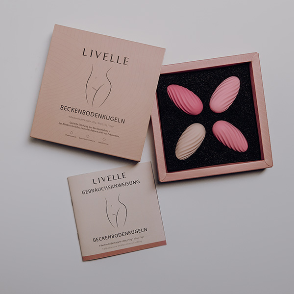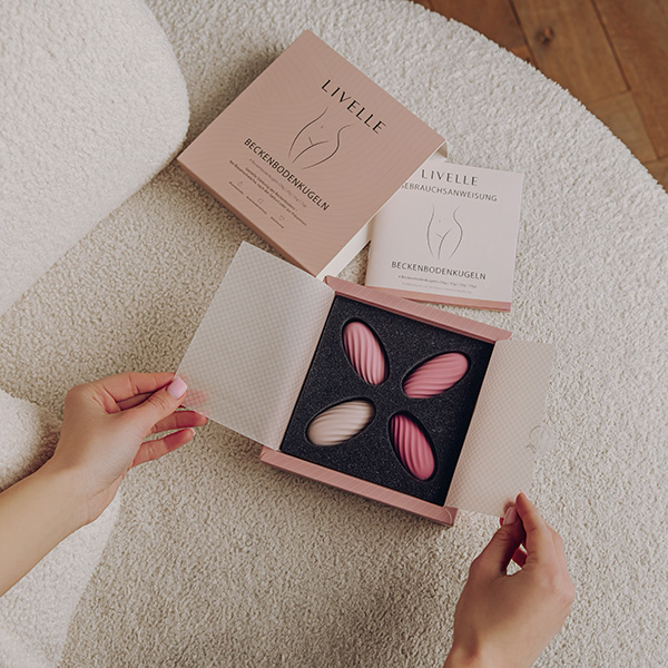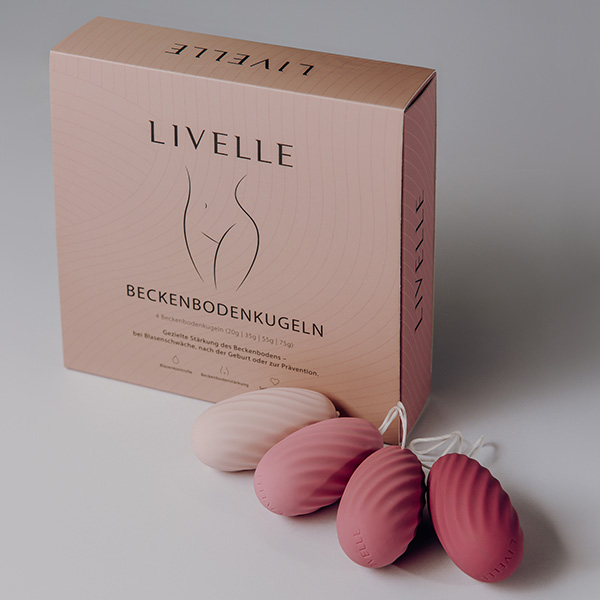 Das LIVELLE Beckenbodenkugeln 4er Set begleitet dich genau dabei: vier Kugeln mit unterschiedlichem Gewicht (20 g, 35 g, 55 g, 75 g), bei identischer Größe von 6 × 3 cm. So bleibt das Gefühl im Körper vertraut, während du dein Training Schritt für Schritt und in deinem Tempo aufbauen kannst.